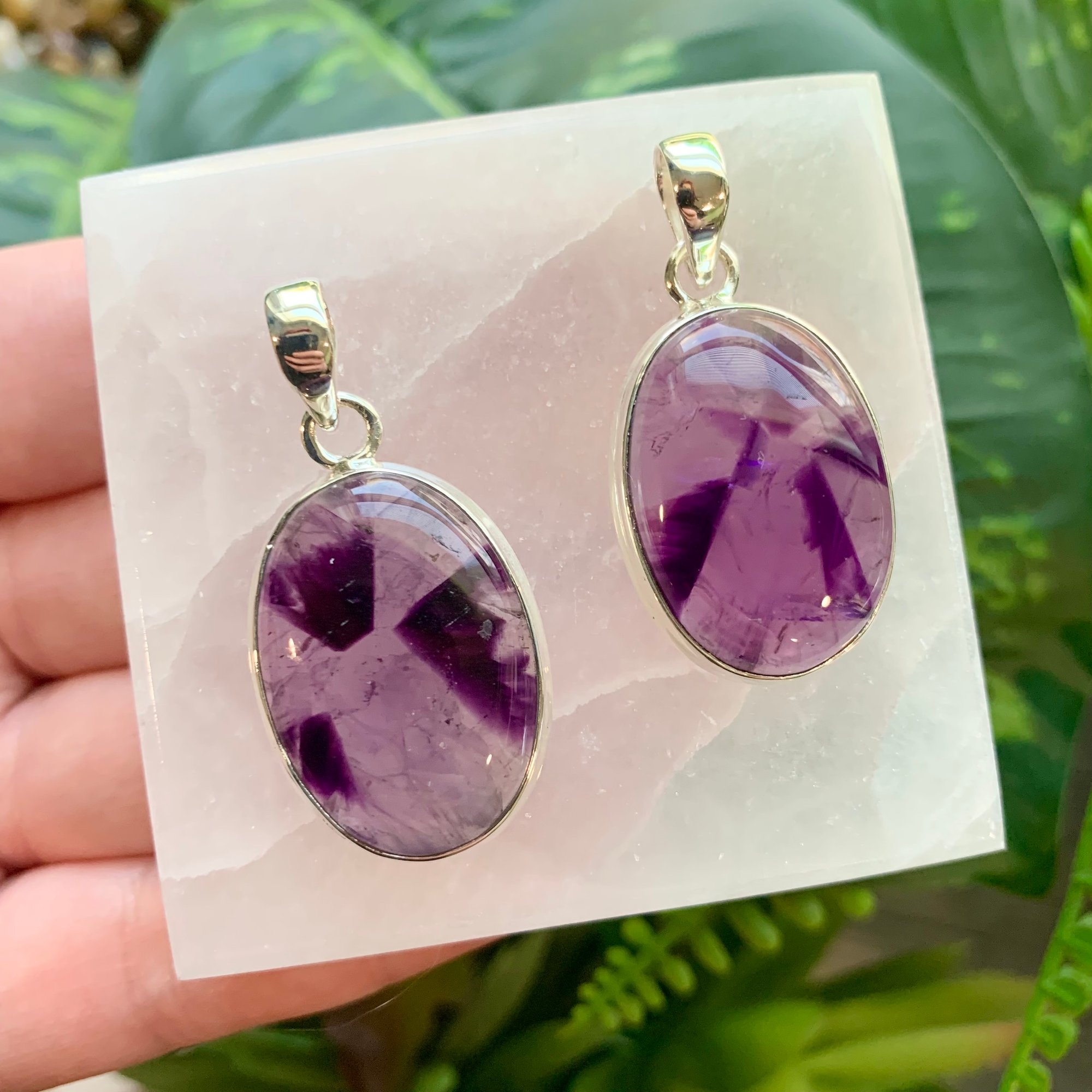 ✩ High quality atomic amethyst cabochons in sterling silver backing. Includes 18" necklace chain