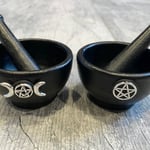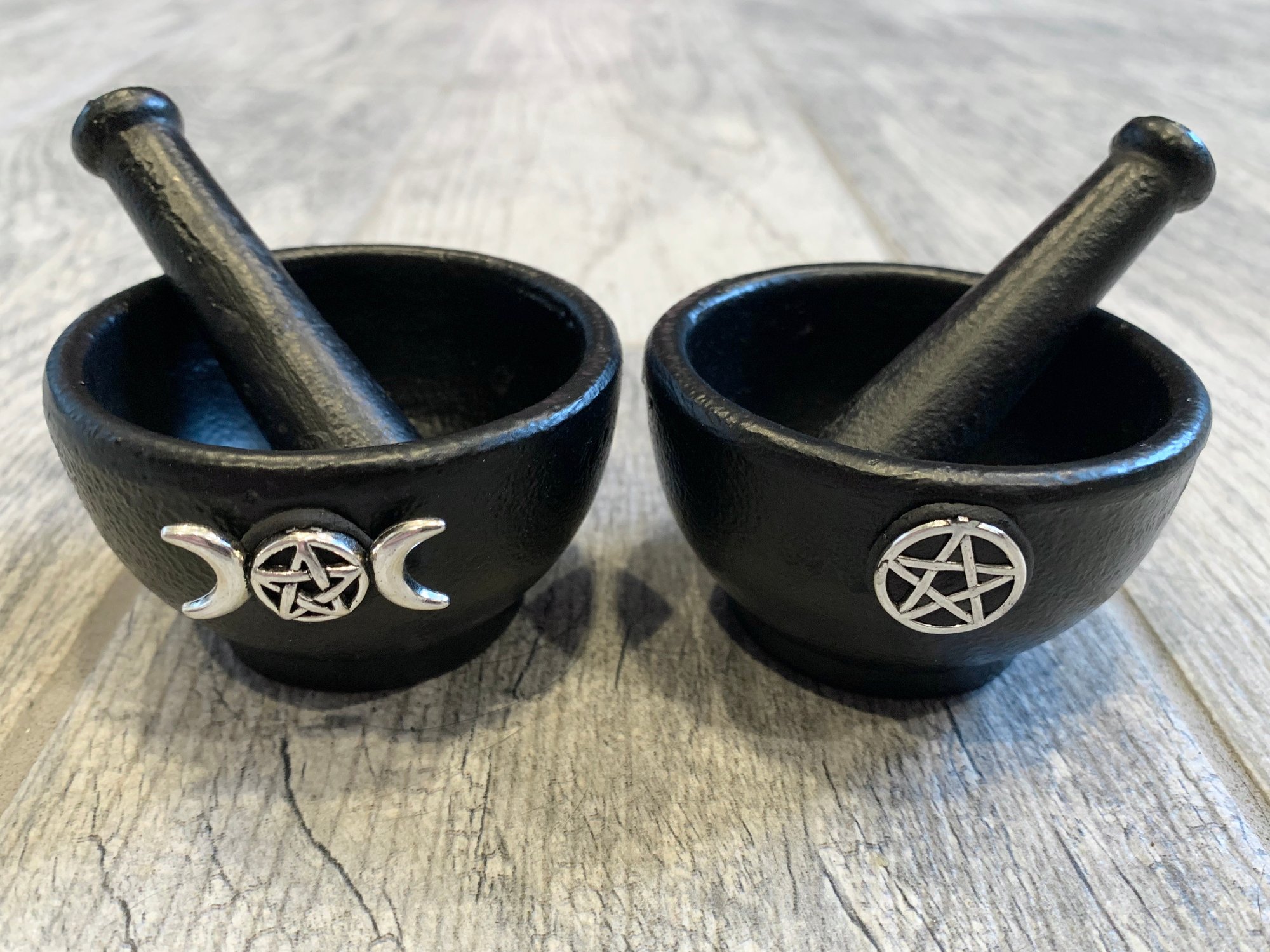 A witch essential with our own personal touch. Cast iron pestle & mortar combo hand decorated with your choice of a triple moon or pentacle charm. Measures 1.75” x 2.75”