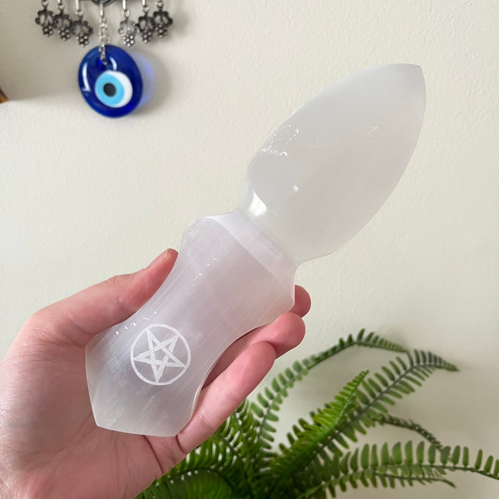 ✩ Satin spar selenite athame with laser etched pentacle design. Approx. 8” x 3”